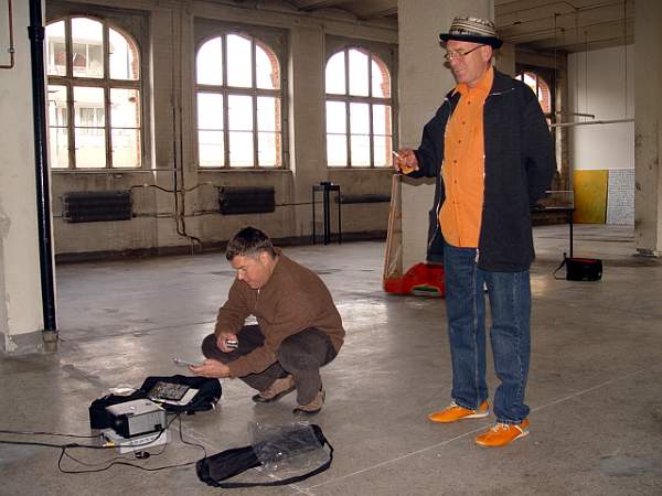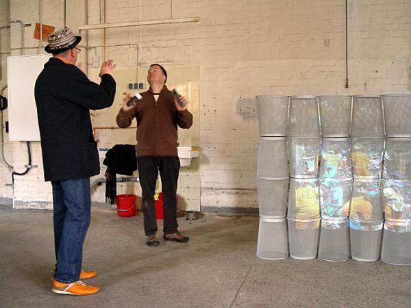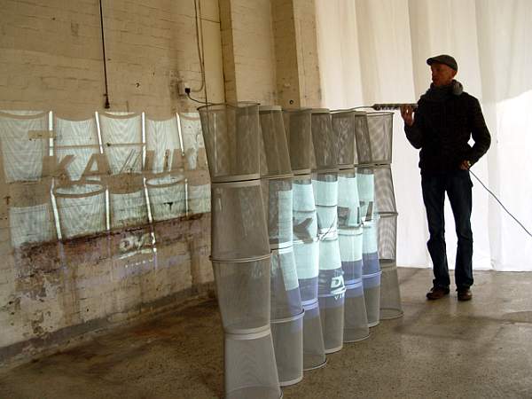 Temporäre Lichtskulptur auf 26 Müllbehältnisse (Papierkörbe) jeweils signiert, Beamer, 1 DVD Player, DVD Müll Bunt 8:29 Min. Auflage 1/7erworben von: